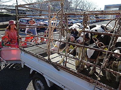 赤ちゃん牛に哺乳瓶を取られる子どもたち。(笑)