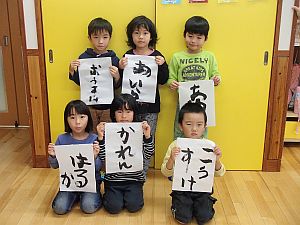 そして、今日は書初めを行いました!!たいよう組さんにとっては初めての経験で興味津々の子ども達・・・(@_@)