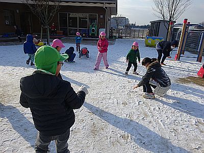 男の子は雪合戦。 先生も当たって雪まみれ!!