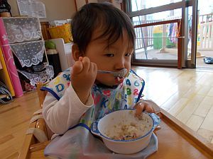 テーブルの上にこぼしながらも、上手に自分でスプーンを持って食べることが出来ていますよ!!