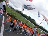 ふれあい館の駐車場には沢山のこいのぼりがあり、そのこいのぼりをみると大興奮の子ども達。