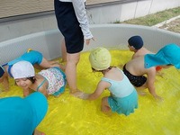 お友だちと「ひゃあ♪」と言いながら水をかけあったり、誤って自分のかけて「ふえっ(+_+)」となったりと各々に水遊びを楽しんでました。