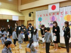 拍手の中、入場してきた子ども達は緊張した表情でしたが、証書授与では自分の名前を呼ばれるとかっこよく返事をして、園長先生から証書を貰いました。