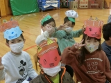 新聞紙で作った鬼と豆を使って鬼退治を頑張りました。