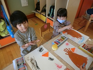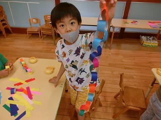 手形で木を描いたり、外で思いっきり絵具遊びをしたり、七夕やクリスマスなど折り紙で飾りを作ったり、牛乳パックを使って自由に作ったりたくさんの物を製作しました。