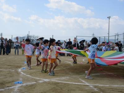 最後を飾ったのは、ほし組のバルーンと親子遊戯です。バルーンは練習をしている時から、とても意欲的で楽しみながら練習に取り組んでいました。本番もみんなで力を合わせ、最後までやりきることができたのではないでしょうか。カラーボールも今までで一番、空高く飛ばすことができていたと思います。親子遊戯のへんしんベルトも、お父さんやお母さんと一緒に楽しみながら踊ることができグルグル回してもらう子どもたちはとても嬉しそうでした。