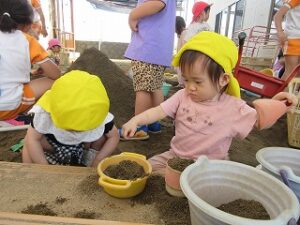 裸足でも怖がらず、足の裏で砂の感覚を楽しんだり、沢山体を動かす事を楽しみました。