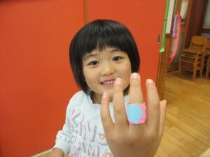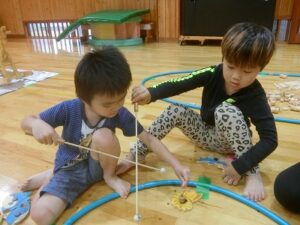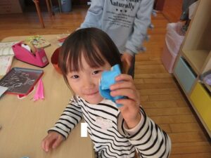 室内遊びでは工作に夢中になる子どもたち。はさみやのり、セロハンテープを使いながらイメージしたものを作り素敵な作品が出来上がっていました。年下の子は年上の子の真似をしてはさみを使ったり、年上の子は年下の子の工作の手伝いをしたりアドバイスをしてくれたりなど微笑ましい場面がたくさん見られました。