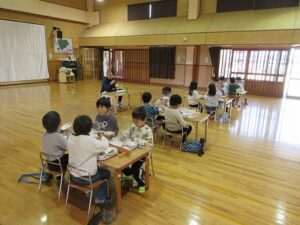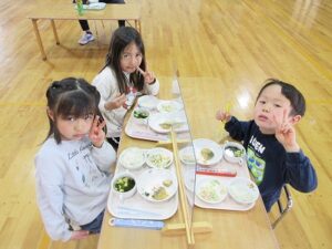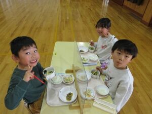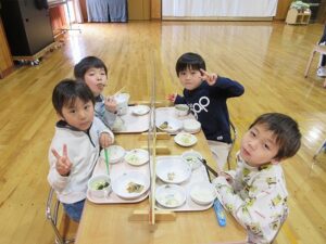 2月の最後の体育遊びの日には、ほし組みんなから手作りのカレンダーをプレゼントを渡した後に、先生と一緒にお別れ会食を行いました。