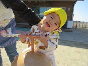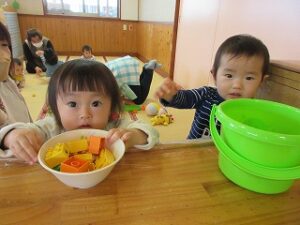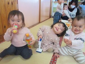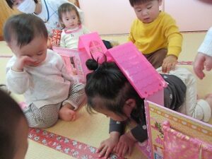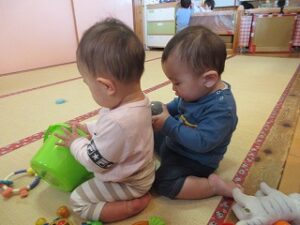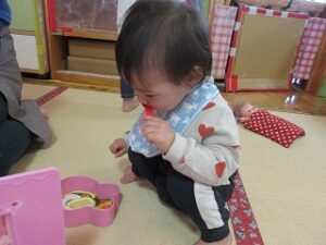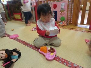 お友だちと遊ぶ姿も増え、一緒に同じものを使って遊んだり、ままごとではお友だちに食べさせてあげたりと、交友関係が広がっており成長を感じています。