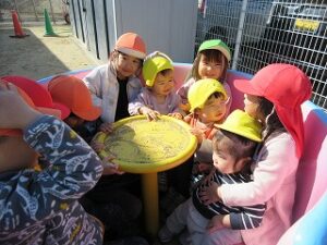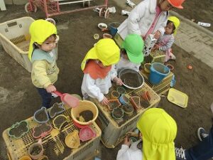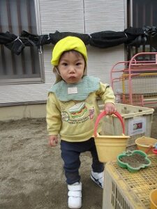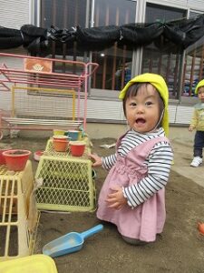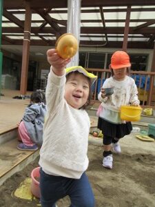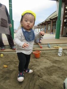 砂場遊びが人気で、以上児さんと一緒に遊んだり、砂をバケツに入れたりと真剣に遊ぶ表情が見られました。