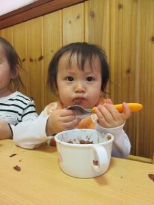 スプーンの持ち方も上手になり、ほとんど1人で食べれるようになりました。