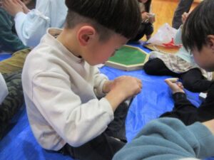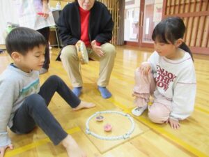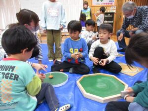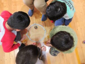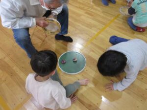 いよいよ待ちに待った大会の日です。子どもたちは時間があれば、コマ回しの練習をしていました。緊張した表情の子どもやワクワクしている子どもたちの様々な姿が見られました。残念ながら負けてしまい、悔し涙を流してしまう子どもの姿も見られましたが周りの友だちが「大丈夫だよ」と励ましてくれる優しい姿もありました。