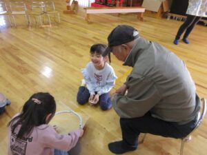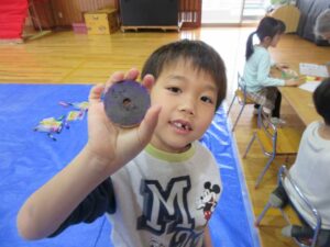 合志木工おもちゃ愛好会の惠さんが、ほし組さんにためにコマを準備してくださり、自分たちでコマをツルツルになるまで、やすりで削ったり軸を金槌を使って打ち込んだりとコマ作りを楽しみました。
