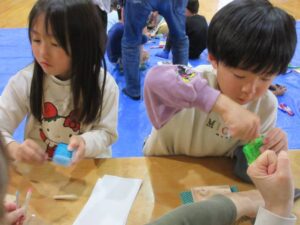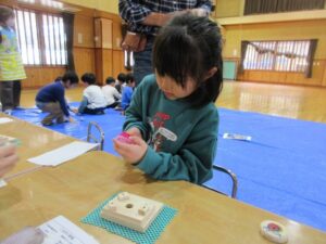 「コマってこうやってできるんだ」「もうツルツルになったかな?」「楽しいね」とお友だちと会話を楽しみながら作り進めていました。