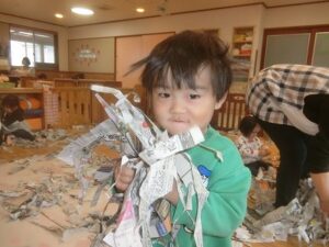 ままごと遊びや、新聞紙遊び。新聞紙はふわふわで楽しかったね。